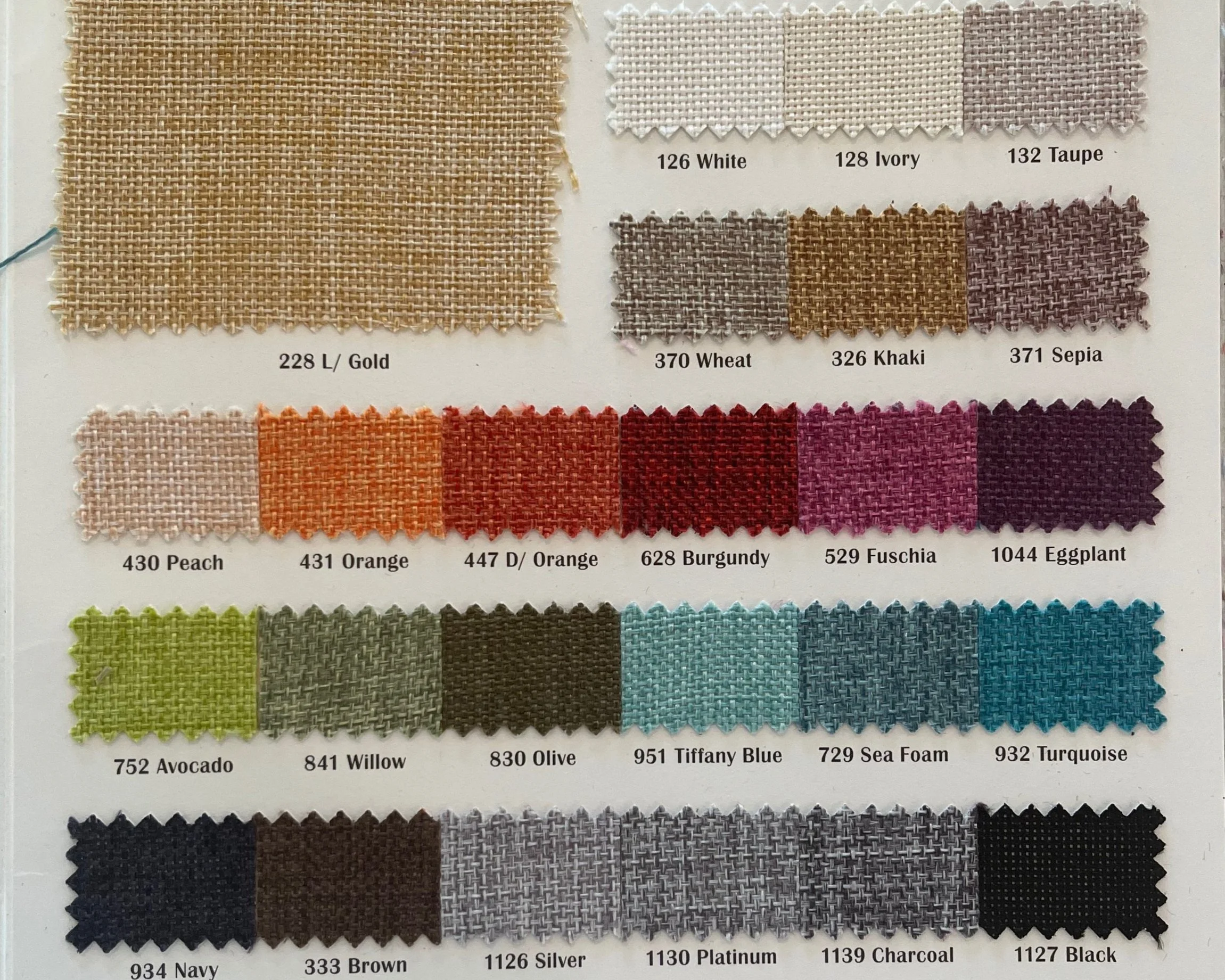 White, Taupe, Fuchsia, Wheat, Gold, Orange, Silver, Green, Blue, Seafoam (other colors can be made as special order)